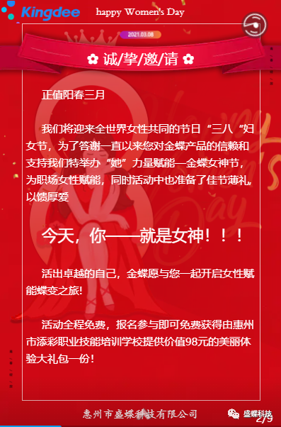 我们将迎来全世界女性共同的节日"三八“妇女节,为了答谢直以来您对金蝶产品的信赖和支持我们特举办“她"力量赋能金蝶女神节,为职场女性赋能,同时活动中也准备了佳节薄礼以馈厚爱